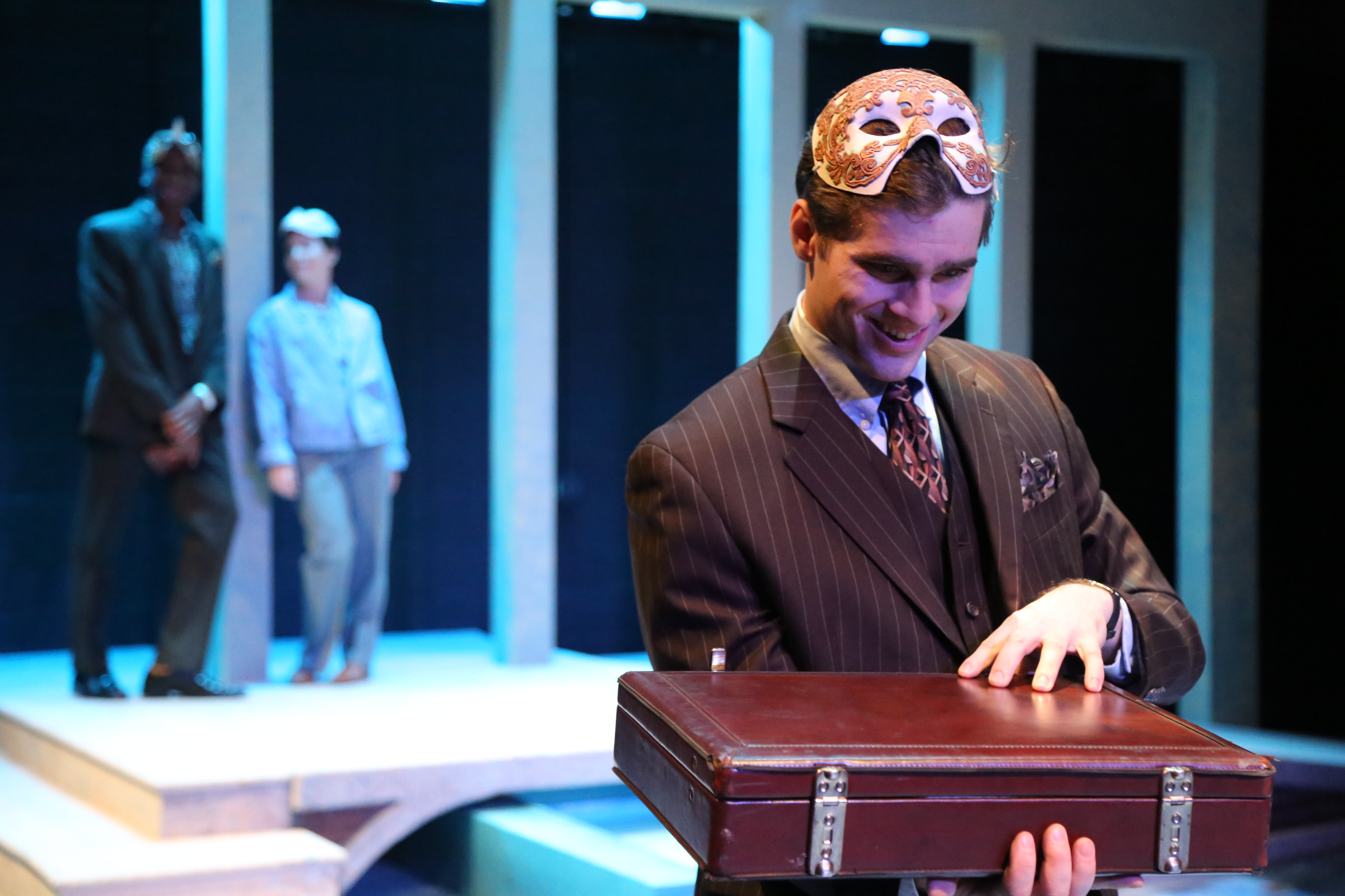 From left to right: Alex Brightwell (Antonio/Tubal/Ensemble), Gregory James (Bassanio/Prince of Arragon/Ensemble), and Elisabeth Yancey (Shylock/Ensemble). Photo Credit: Kristin Netzband