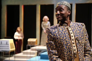 Foreground: Conor Canning (Lorenzo/Duke of Venice/Ensemble). Background: Comfort Dolo (Jessica/Solanio/Ensemble) and Courtney Stennett (Nerissa/Salarino/Ensemble). Photo Credit: Kristin Netzband